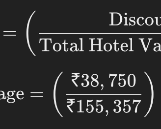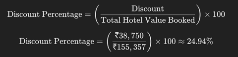 To find the percentage discount, divide the discount by the total hotel value booked and multiply by 100:
